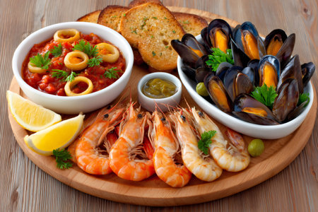 A vibrant assortment of seafood cicchetti including shrimp, mussels, and herbs, elegantly arranged on a wooden platter, perfect for gourmet dining.