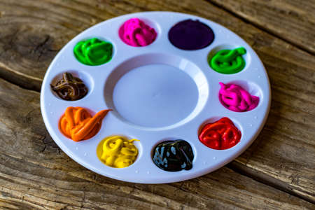 A colorful artist's palette with paints, showcasing an array of vibrant colors in a creative setting.