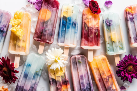 Flat lay photo of frozen icepops and colorful edible flowers on white background. Natural summer desserts. Generative Ai