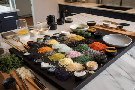 plate of deconstructed sushi roll, with ingredients and tools on display, created with generative ai
