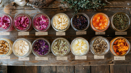 An array of beautifully arranged dried herbs and flowers in glass jars on a rustic wooden table, showcasing vibrant colors and natural textures for herbal enthusiasts and wellness practitioners.