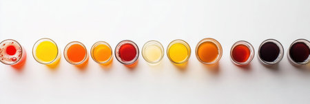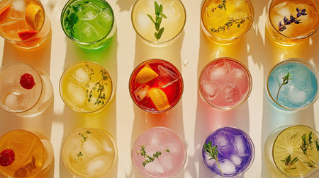 Glasses filled with assorted drinks like juice, tea, and soda are neatly arranged on a white background, inviting creativity and refreshment.