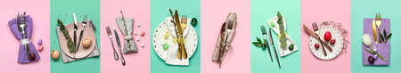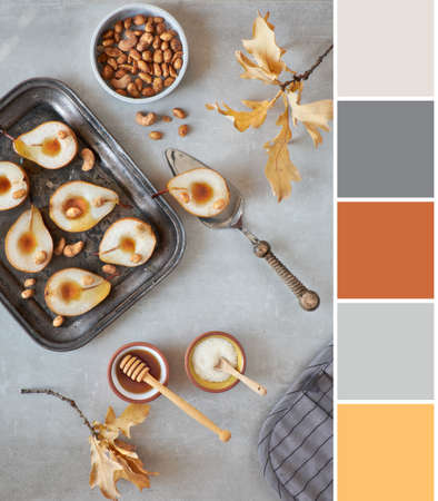 Color matching palette from image with baked pears and caramelized nuts on gray concrete background decorated with Autumn leaves