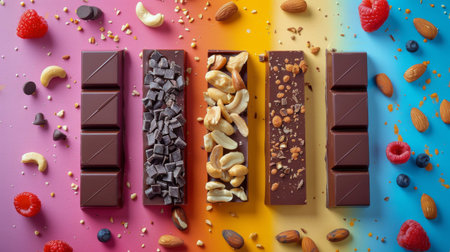 Chocolate bars neatly arranged on a rainbow-colored table.