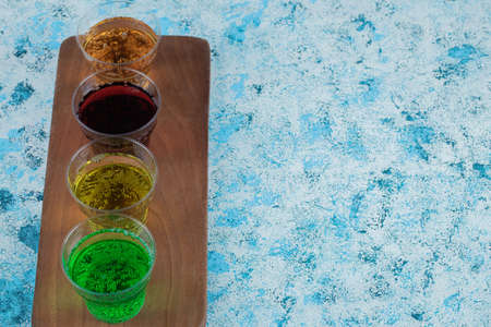 A vibrant collection of colorful beverages arranged on a table, showcasing a refreshing assortment of drinks perfect for summer events and gatherings.