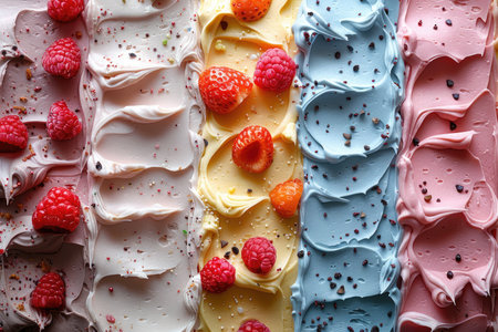 Close-up of texture of creamy ice cream of different flavours, gelato background. Generative AI.