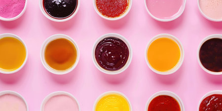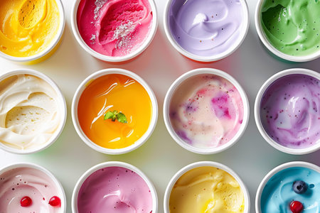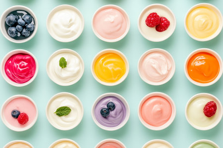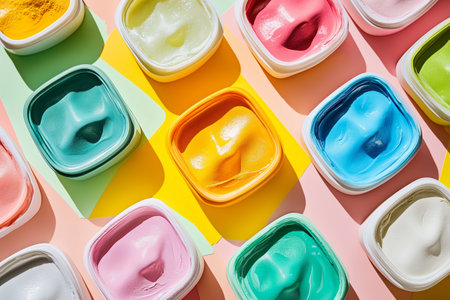 A delightful composition of various flavored yogurt containers, each offering a taste of creamy indulgence in pastel hues
