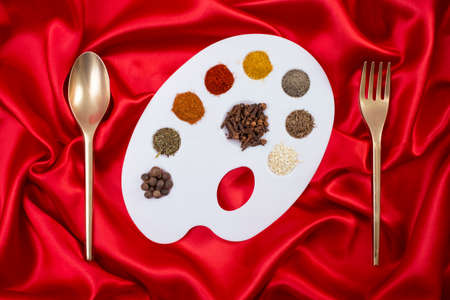 painter's palette full of colorful spices and golden cutlery on red satin background