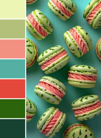 Green and Pink Macarons on Blue Background with Color Palette - Stylish French Desserts.