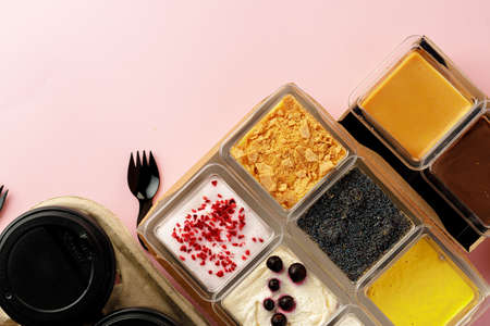 Mousse desserts in square plastic boxes with different toppings on pink table
