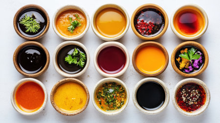 A selection of colorful sauces in small rustic bowls, artfully arranged on a clean white surface, viewed from above, perfect for culinary presentations