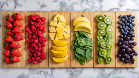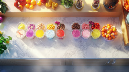 A top-down view of a colorful smoothie bar setup with different smoothie bowls and fresh ingredients, placed on a marble countertop.