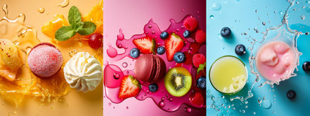 A dynamic arrangement of assorted sweets, macarons, and fruits like strawberries, kiwi, and blueberries, presented in a vibrant and colorful setting with splash effects, creating an energetic and appetizing visual.