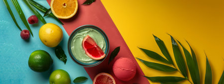 A colorful arrangement of tropical skincare and beauty products, complemented by fresh fruits like lemons and grapefruits, set against a vibrant tri-colored background, highlighting a fresh and exotic theme.