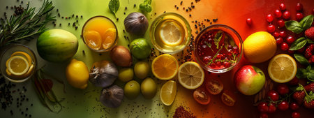 A vibrant assortment of fruits, herbs, and spices displayed in warm, moody lighting. The rich colors and varied textures create a dynamic and appetizing scene, perfect for food, culinary, and health-related content.