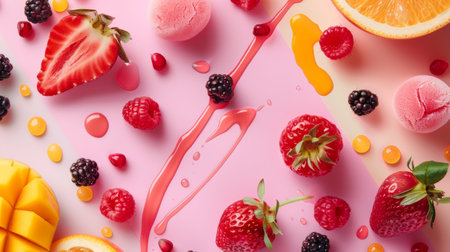 A creative flat-lay image of fruit smoothie splatter surrounded by fresh strawberries, berries, and citrus slices on a vibrant pink background.