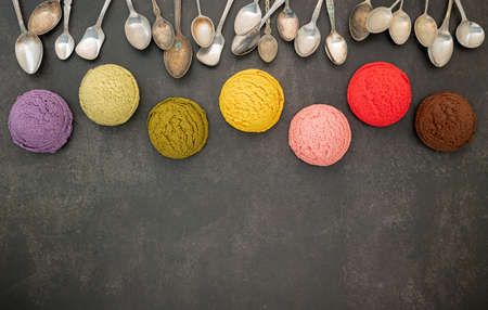 Various of ice cream flavor blueberry ,pistachio ,almond , orange, green tea and chocolate setup on dark stone background . Summer and Sweet menu concept.
