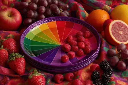 Discover a vivid geometric plate full of healthy fresh fruits including berries and apples on a colorful textile background, perfect for healthy eating inspiration.