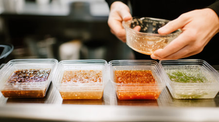 A chef prepares an array of vibrant sauces in clear containers lined up on a metal countertop, showcasing the artistry of culinary creation and flavor.