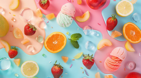 Colorful citrus fruit slices arranged as a popsicle, floating in cool blue water with ice, create a refreshing summer concept. Ai generated image