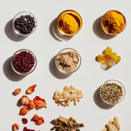 A visually appealing, organized display of various herbs and spices on a white background, showing vibrant colors and diverse textures in a flatlay composition.