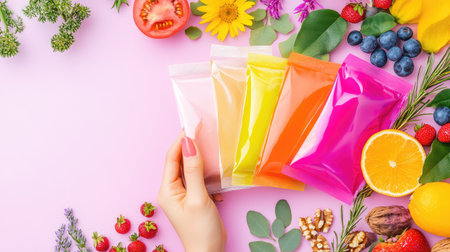 A vibrant flat lay composition featuring colorful ingredients, hand holding packets of pure colors, fruits, and natural elements on a pink background.