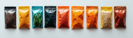 A set of vibrant seed packets for flowers and vegetables, laid out on a white surface