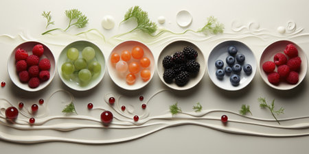 This stunning image showcases a vibrant assortment of fresh fruits and edible flowers artfully arranged in elegant plates. Perfect for highlighting healthy dining options and culinary creativity.