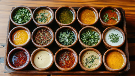 A stunning display of various sauces and spices in small bowls, beautifully arranged on a wooden tray. Perfect for showcasing culinary creativity and flavors in food photography.