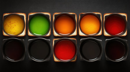 This visually appealing image showcases an array of colorful sauces displayed in square bowls against a dark background, ideal for food-related projects or culinary inspirations.