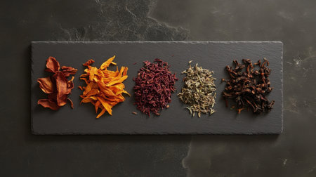 A visually appealing composition of colorful dried spices and herbs on a slate board, perfect for showcasing culinary artistry and enhancing food presentation in various recipes.