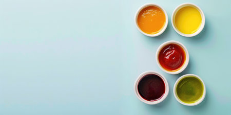 horizontal banner, set of small round saucers with different sauces for meat, fish and fast food, top view, blue background, copy space, free space for text