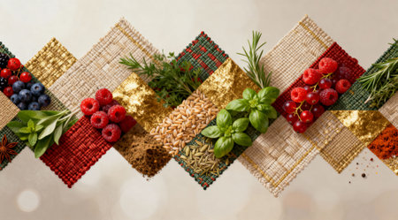 A creative digital illustration depicting Professional illustration of abstract food tapestry, woven patterns of edible elements, studio lighting, commercial digital art. This AI-generated artwork features unique visual elements suitable for various commercial and editorial applications. AI-generated illustration.