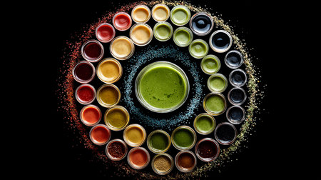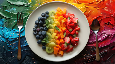 A creative digital illustration depicting Abstract food art featuring a kaleidoscope of flavors, vibrant and dynamic, natural lighting, professional digital art. This AI-generated artwork features unique visual elements suitable for various commercial and editorial applications. AI-generated illustration.
