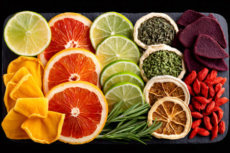 Grapefruit and lime slices, dried mango, orange, beetroot, goji berries, rosemary, thyme and fennel seeds creating a vibrant arrangement on a dark background