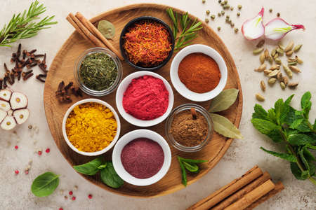 Colorful herbs and spices for cooking: turmeric, dill, paprika, cinnamon, saffron, basil and rosemary. Indian spices in wooden plate. On light brown stone background. Top view.