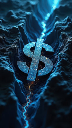 That the image is generated using AI. Sparkling dollar sign in mystical blue landscape.