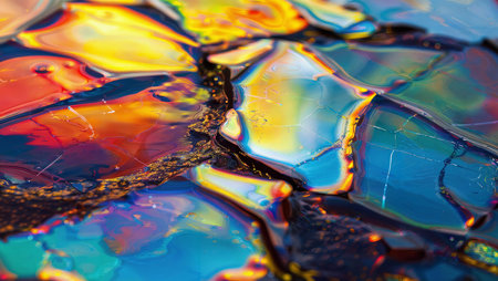 Oil beauty. Shining texture. Gleaming sparkling red blue white yellow coloring creative structure on abstract art dark background.