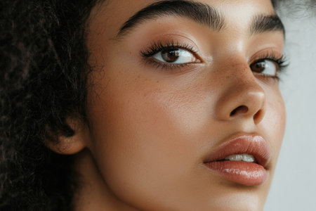 This captivating close-up portrait showcases a beautiful woman's radiant skin and expressive features, emphasizing natural beauty and elegance.