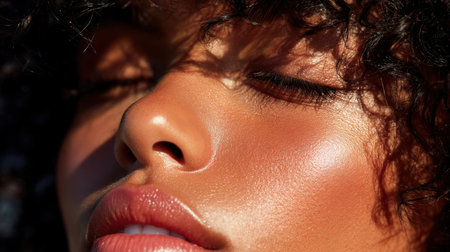 A captivating close-up portrait of a woman with curly hair, highlighting her radiant skin and tranquil expression in a warm sunlight ambiance, celebrating natural beauty.