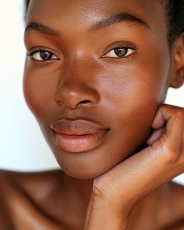 Closeup portrait of a beautiful African woman with dark skin and brown eyes on a neutral background
