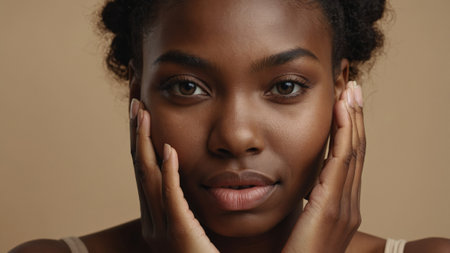 A woman with dark skin smiles while softly touching her cheek. The neutral background enhances her natural beauty and radiance, expressing joy and confidence.