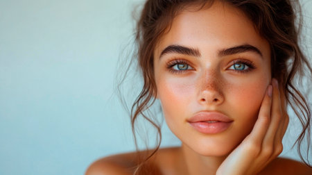 A close-up portrait displays a young woman with radiant skin and a natural beauty look, perfect for beauty, skincare, and cosmetic content.
