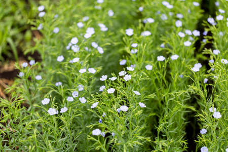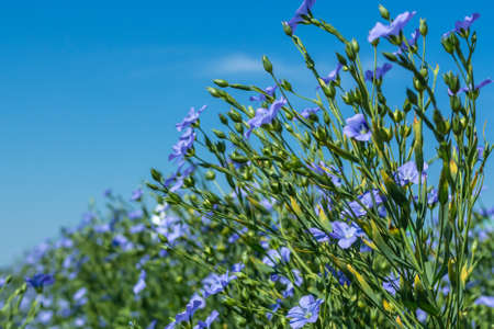 Medicinal plant Flax (Linum Usitatissimum) grows in an agricultural field on a bright sunny summer day