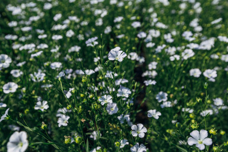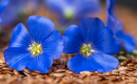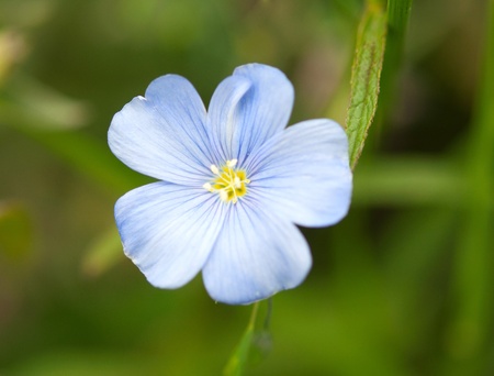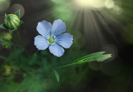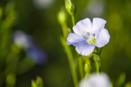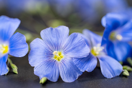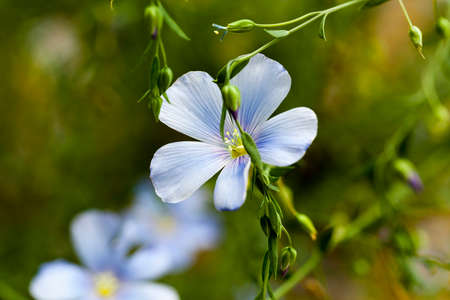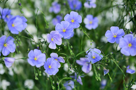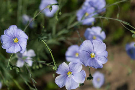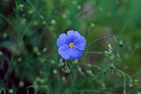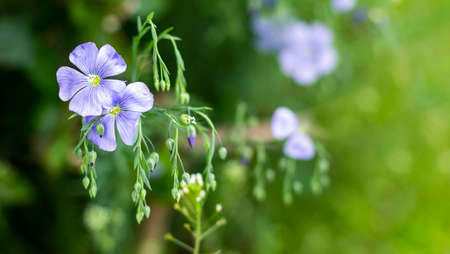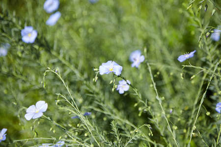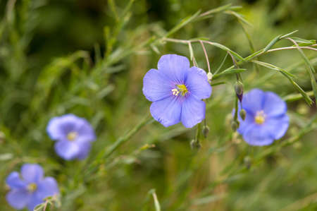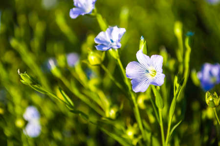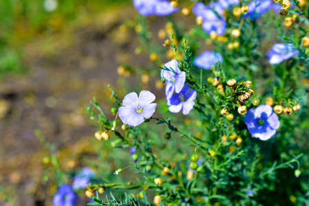 Blue flax or Linum usitatissimum flowers close-up with bokeh background, selective focus, shallow DOF.