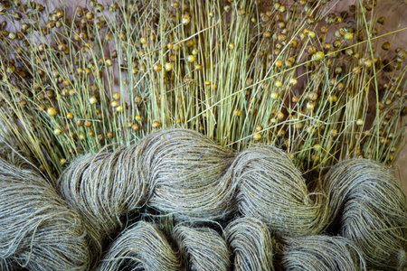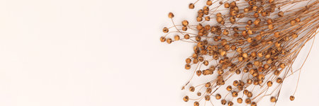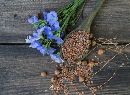composition of flax flowers and suchara with seeds on rustic wooden background