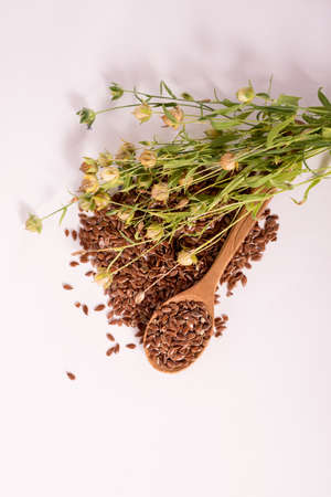 Close up Flax seeds in a wooden spoon. Composition with, flax seeds, and plants on white background. Organic Healthy food background.