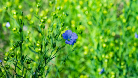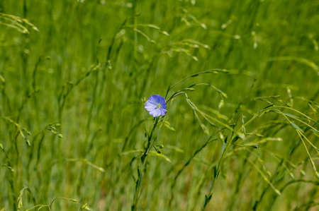 Bright delicate blue flower of decorative flax flower and its shoot on grassy background. Agricultural field of industrial flax in stage of active flowering in summer