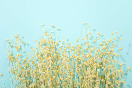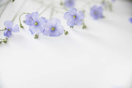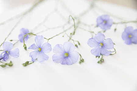 Flax (Linum usitatissimum) flowers over light background, close up shot, local focus