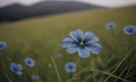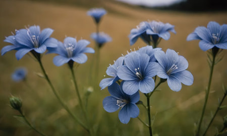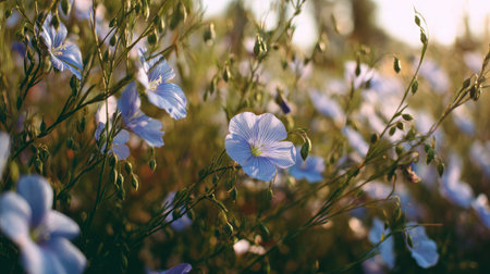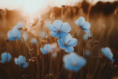 Beautiful blue flax flowers are gently swaying in the warm glow of the setting sun, creating a serene and picturesque scene